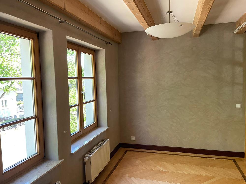 Die schönste Wirkung entfaltet der Feinputz laut unseren glücklichen Kunden in der morgendlichen Sonne, wenn das Licht unmittelbar in den Raum scheint. Aber auch zu allen anderen Zeiten erzeugen die Wandflächen eine angenehme, vitalisierende Raumwirkung im Zusammenspiel mit dem schönen Parkettboden, den Holzbalken und der Einrichtung.