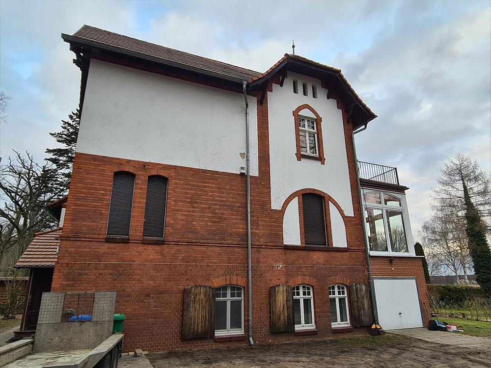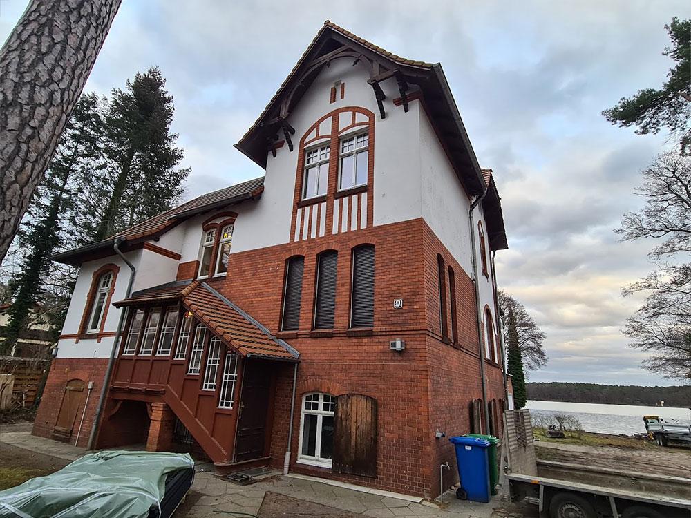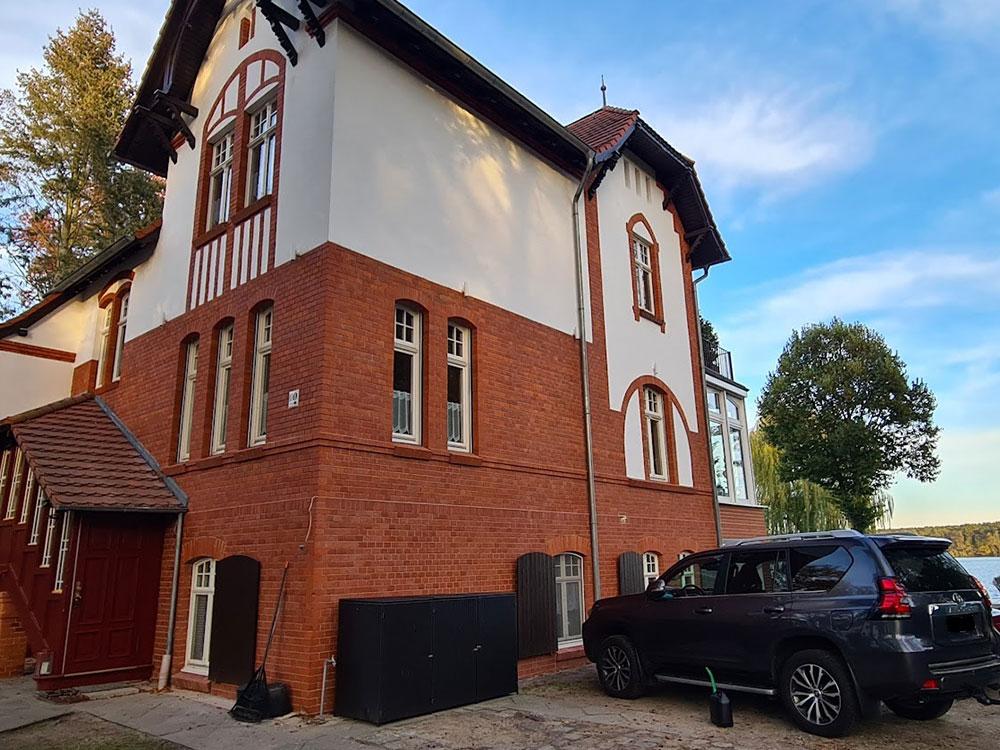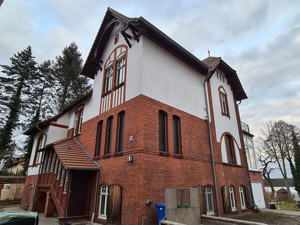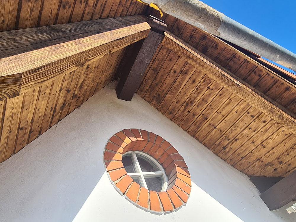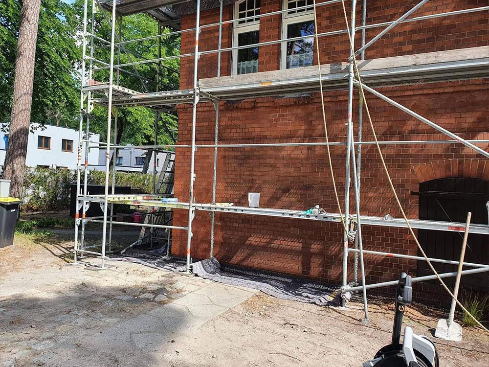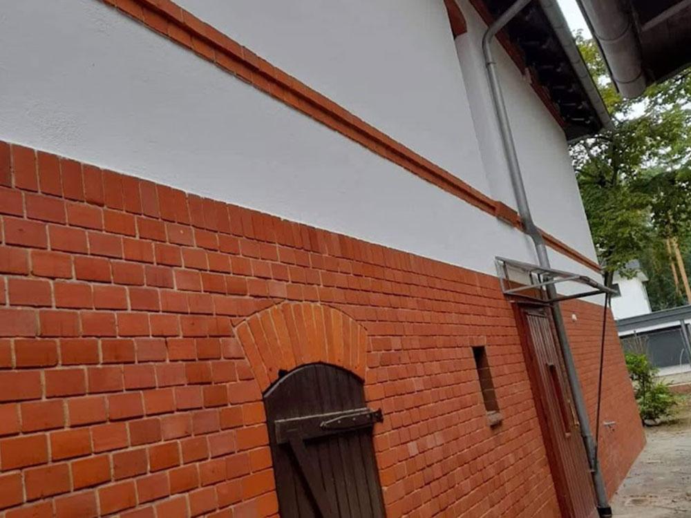 Nachdem wir im Vorjahr die Innenraumgestaltung begleiten durften, stand nun die Sanierung der Fassade auf der Agenda. Die Holzflächen wurden durch Trockeneisstrahlen und thermisches Entschichten von allen alten Anstrichschichten befreit und mit einer Pflanzenölfarbe überarbeitet. Die Klinker haben wir gereinigt, die Fugen saniert, Steinreparaturen ausgeführt und die Substanz hydrophobiert. Putzflächen wurden ausgebessert und bekamen einen neuen mineralischen Anstrich. Diverse Ertüchtigungen einzelner Bauteile runden die Gesamtleistung ab.