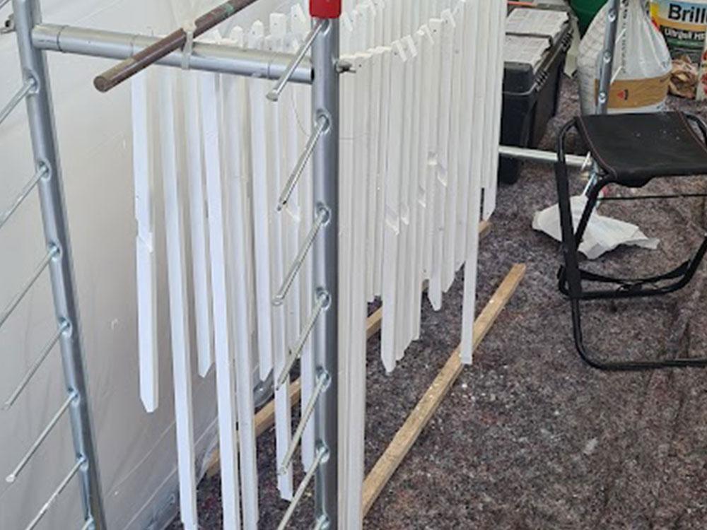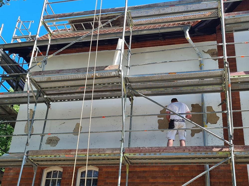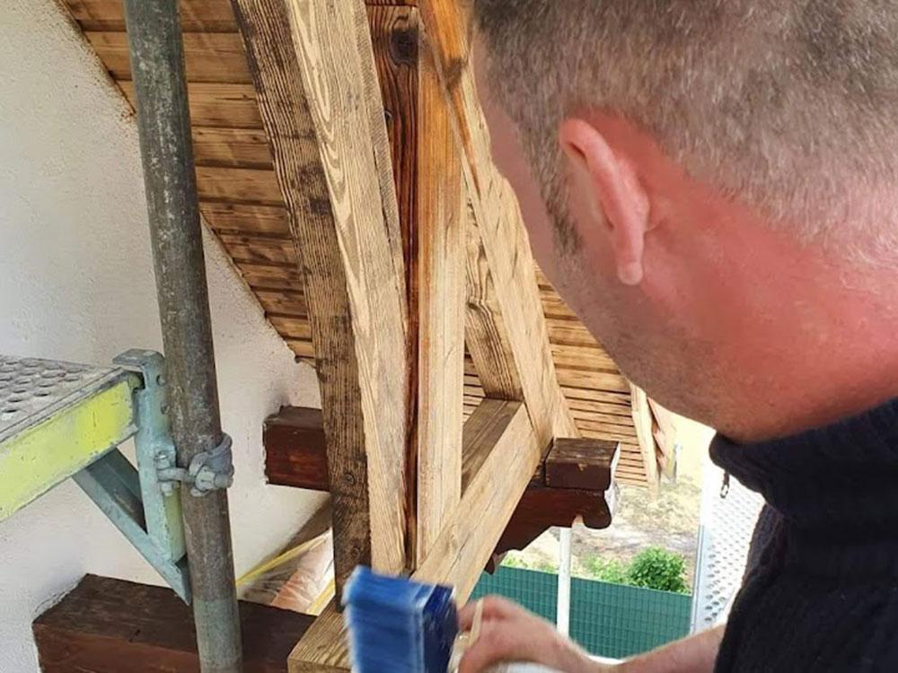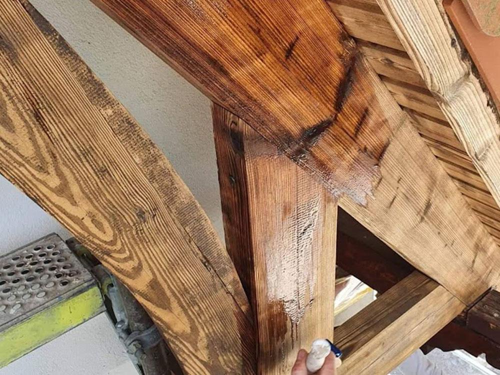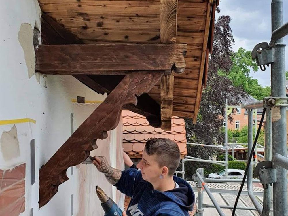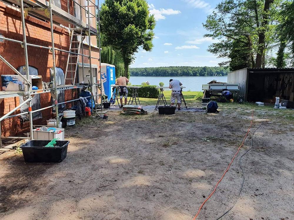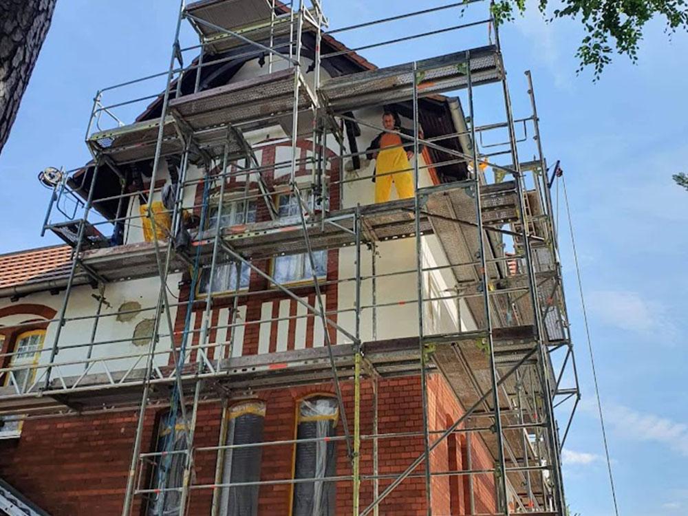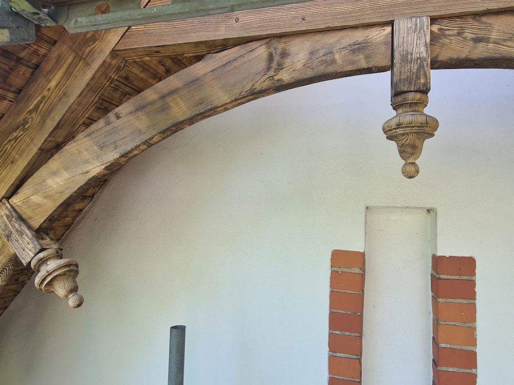 Nachdem wir im Vorjahr die Innenraumgestaltung begleiten durften, stand nun die Sanierung der Fassade auf der Agenda. Die Holzflächen wurden durch Trockeneisstrahlen und thermisches Entschichten von allen alten Anstrichschichten befreit und mit einer Pflanzenölfarbe überarbeitet. Die Klinker haben wir gereinigt, die Fugen saniert, Steinreparaturen ausgeführt und die Substanz hydrophobiert. Putzflächen wurden ausgebessert und bekamen einen neuen mineralischen Anstrich. Diverse Ertüchtigungen einzelner Bauteile runden die Gesamtleistung ab.