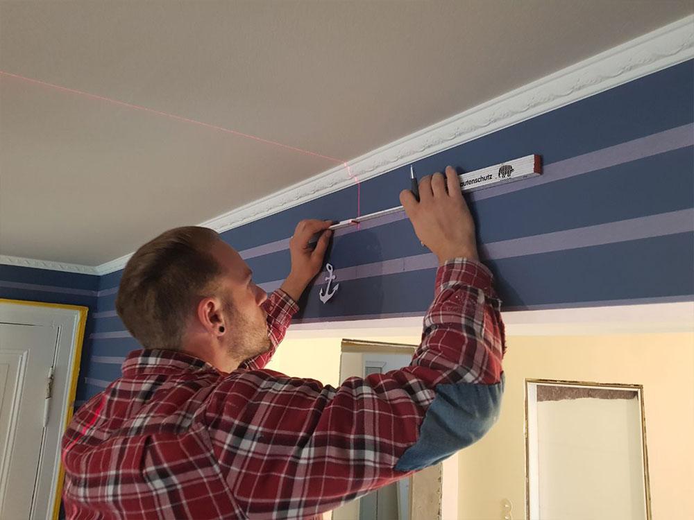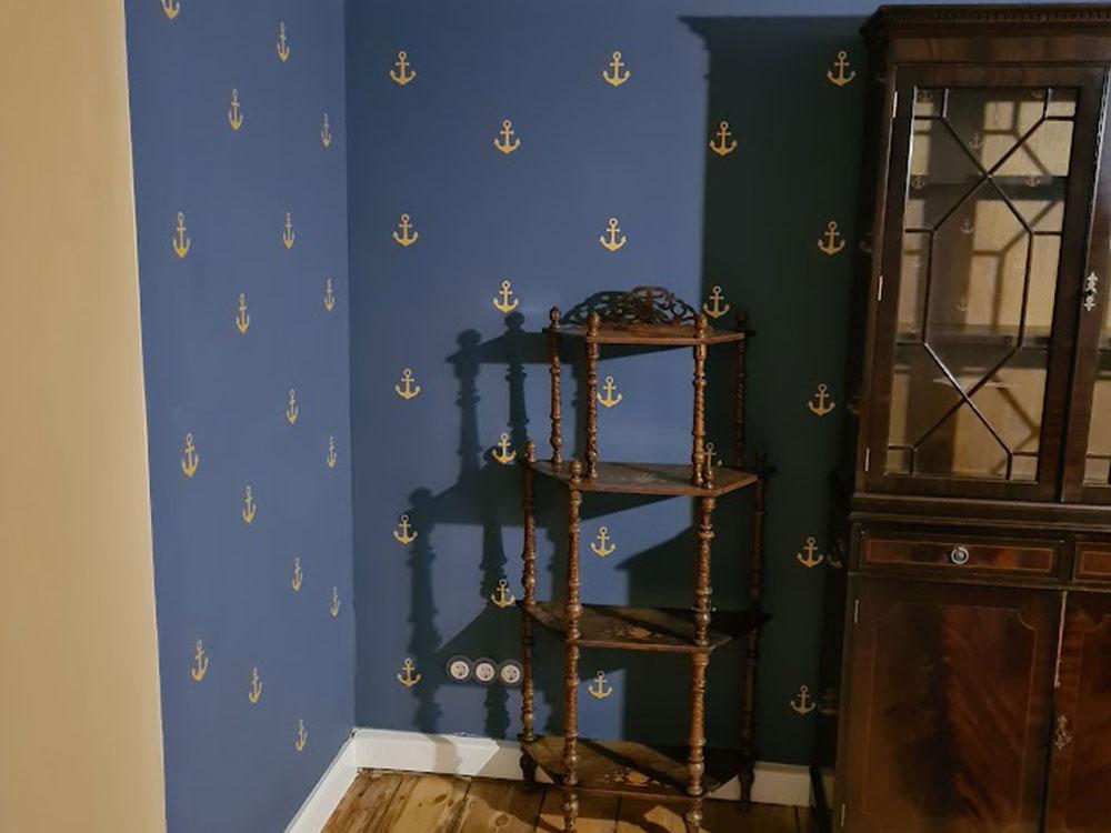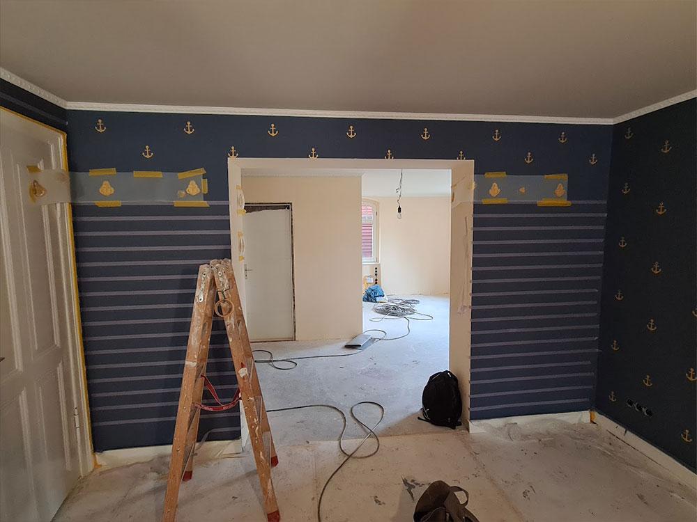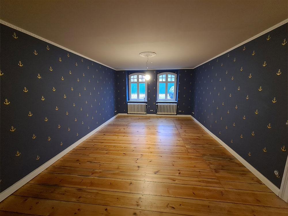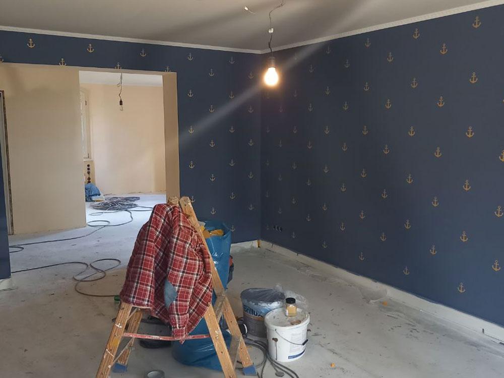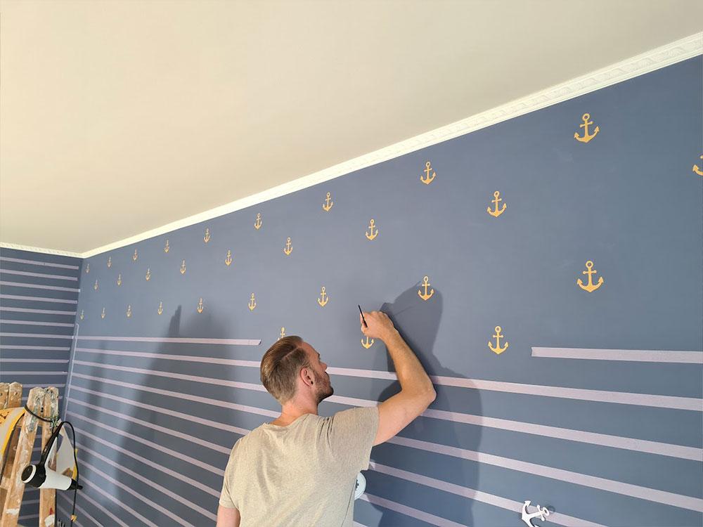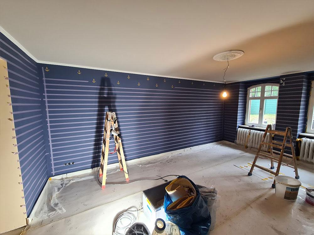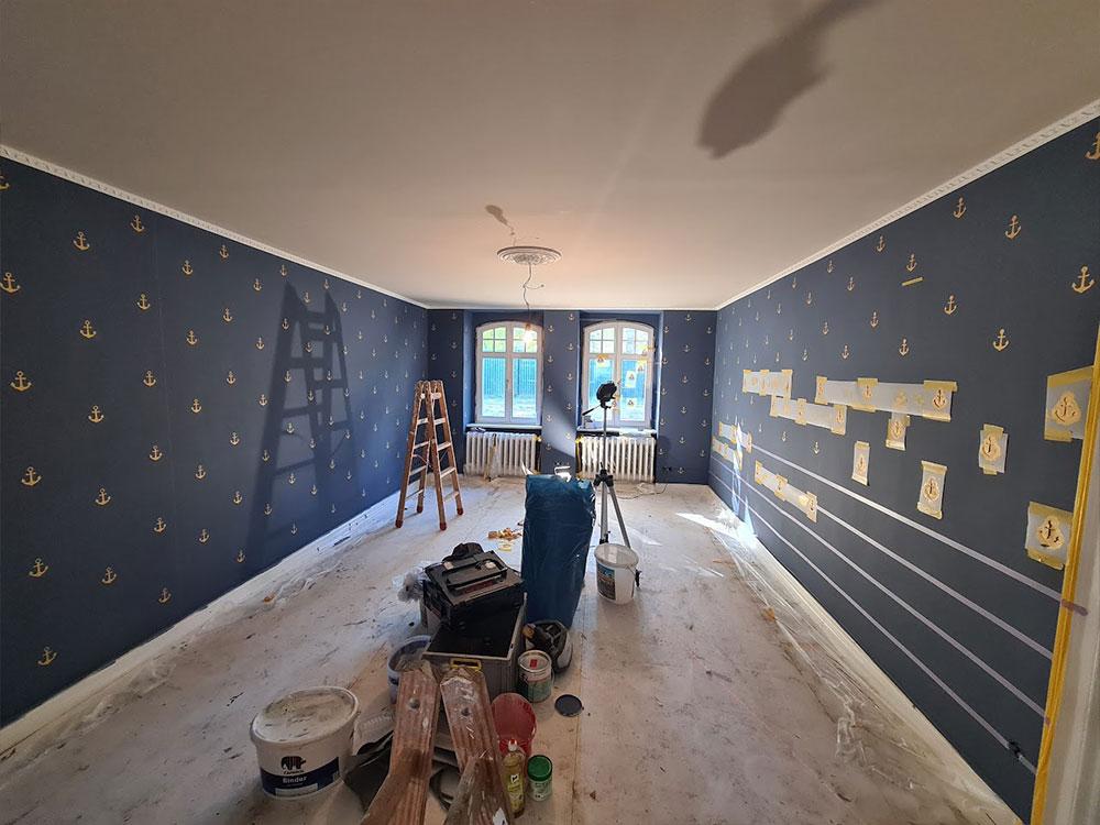 Unsere Kundin war auf der Suche nach einer blauen Tapete mit goldenen Ankern, konnte aber trotz intensiver Recherche nichts Passendes finden, was Ihren Vorstellungen entsprach. So haben wir den Wunschfarbton mit ihr gemeinsam bemustert und händisch angemischt. Die gewünschte Form der Anker mit dem ausgewählten Goldpigment wurde mittels Schablonierung übertragen.