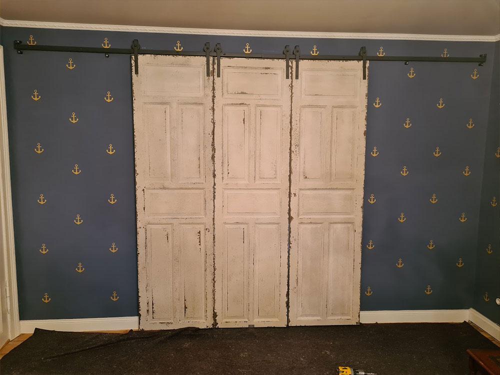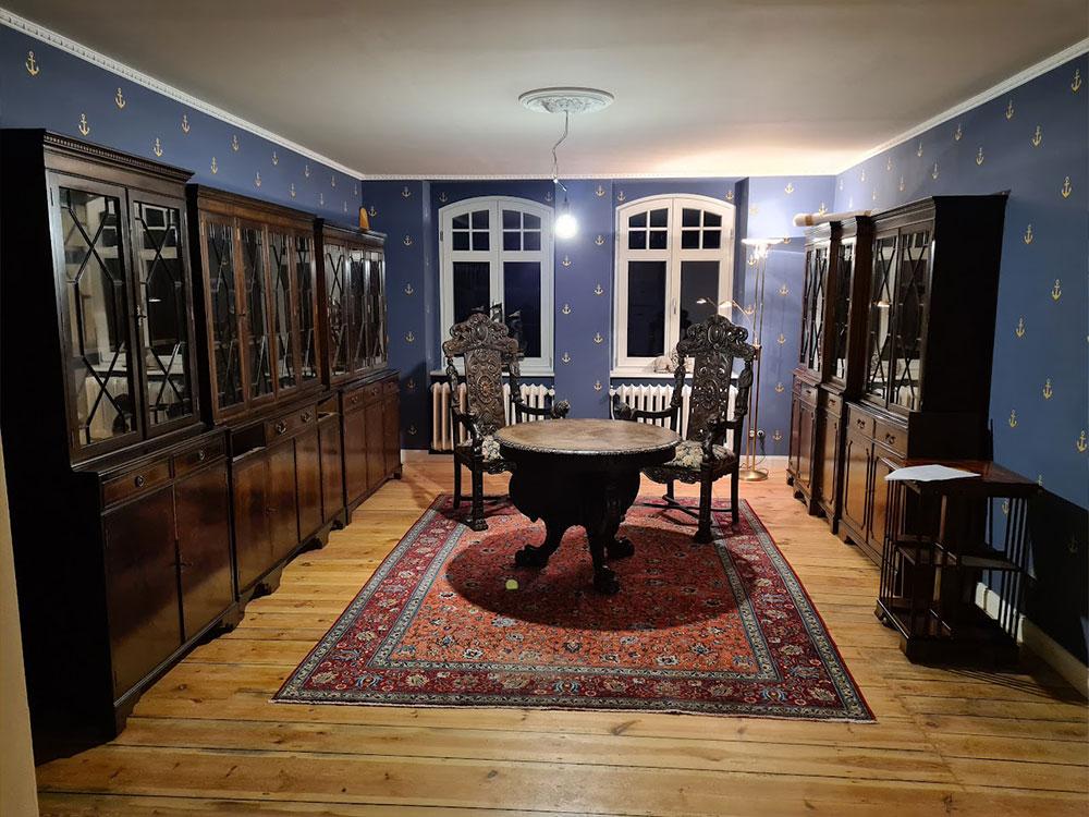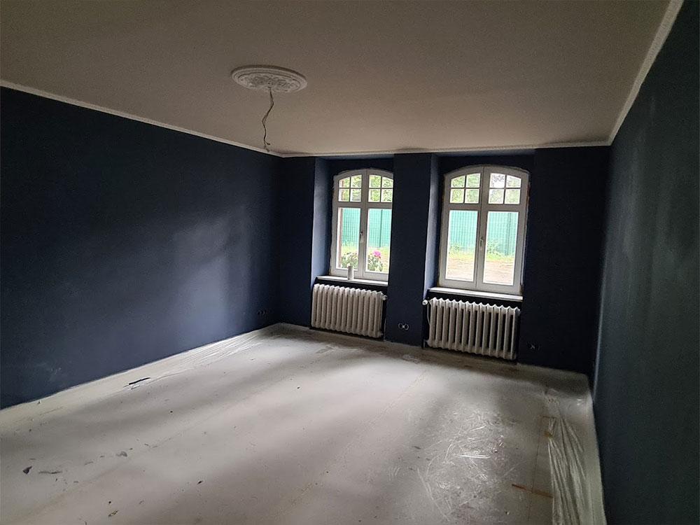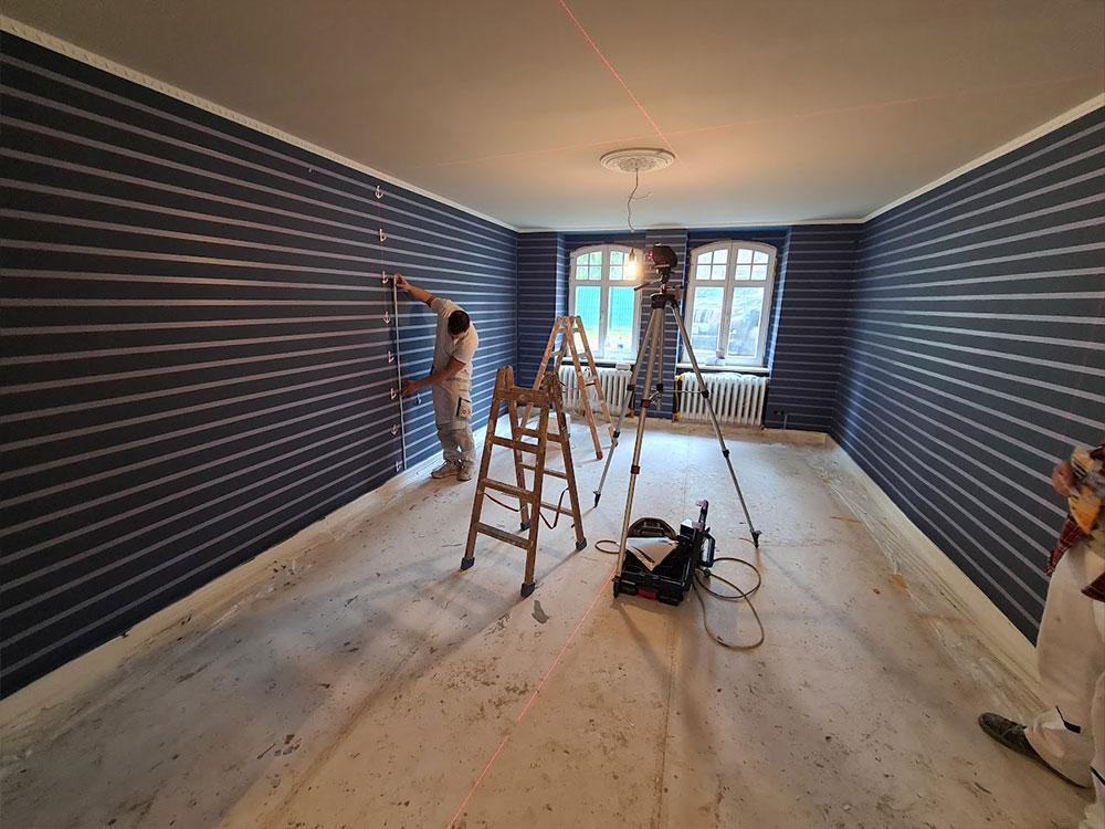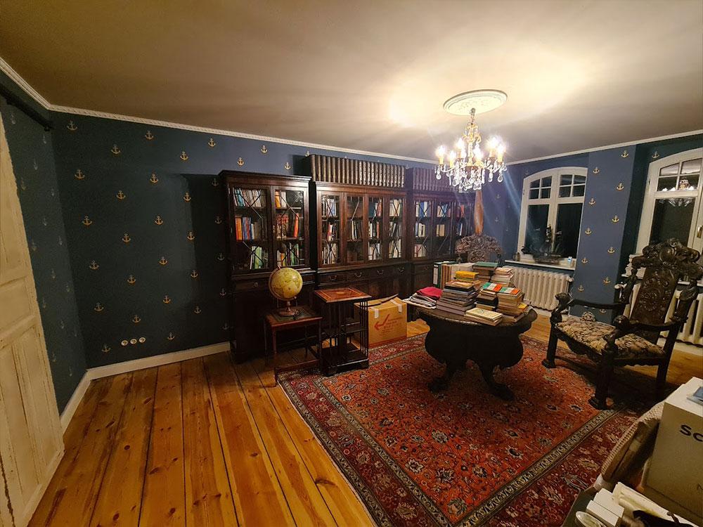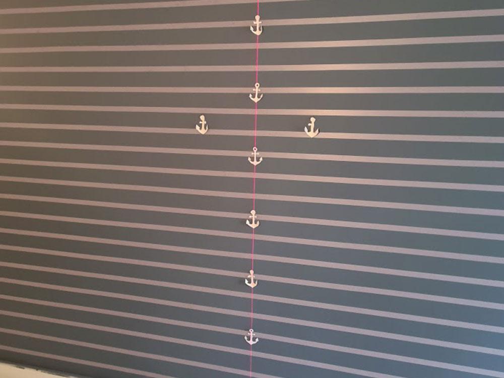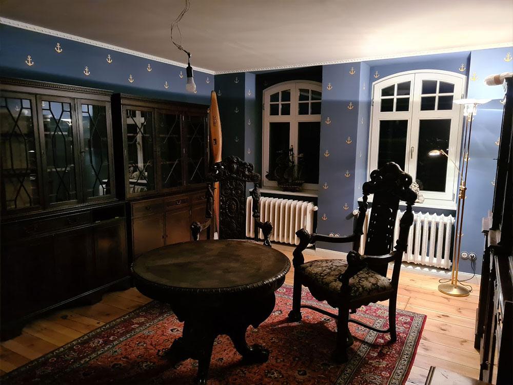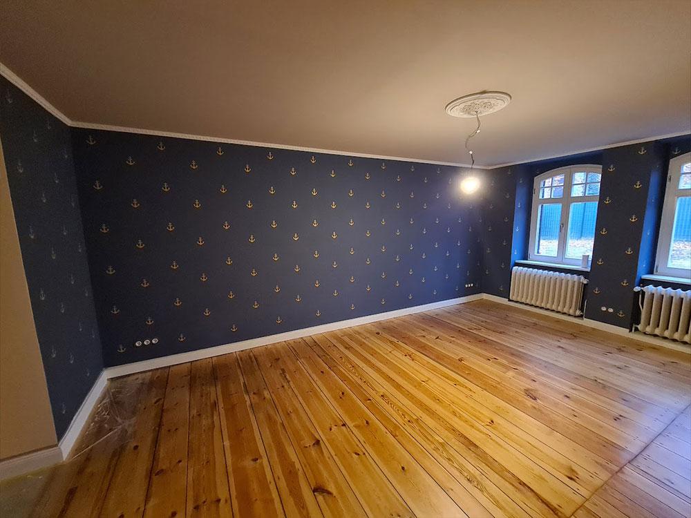 Unsere Kundin war auf der Suche nach einer blauen Tapete mit goldenen Ankern, konnte aber trotz intensiver Recherche nichts Passendes finden, was Ihren Vorstellungen entsprach. So haben wir den Wunschfarbton mit ihr gemeinsam bemustert und händisch angemischt. Die gewünschte Form der Anker mit dem ausgewählten Goldpigment wurde mittels Schablonierung übertragen.