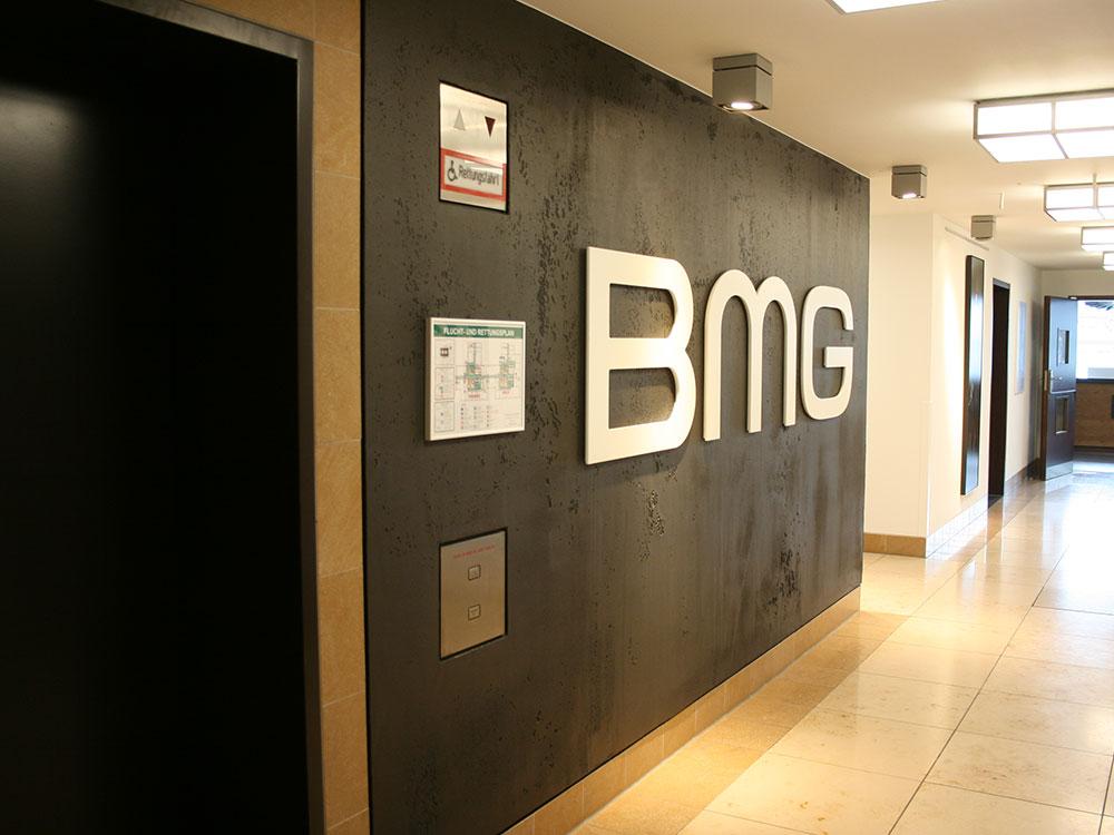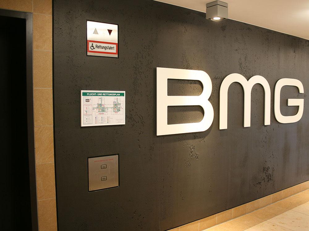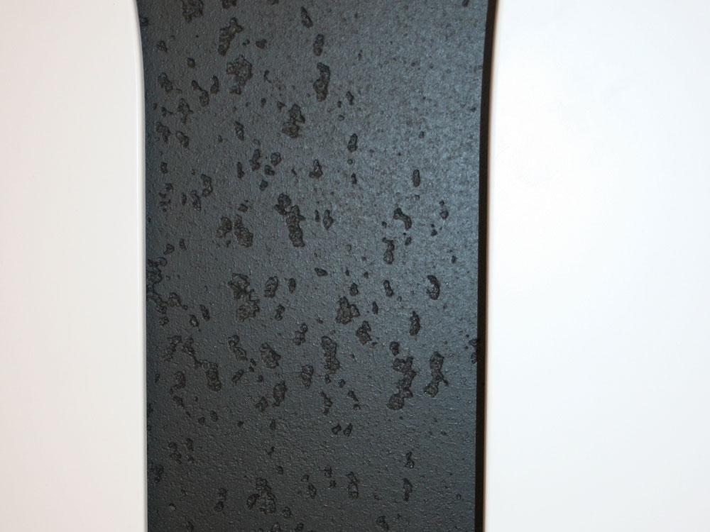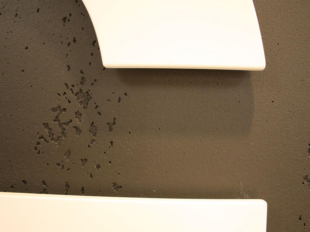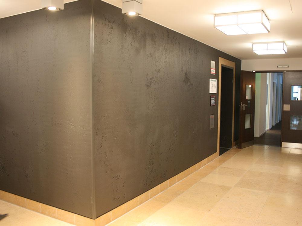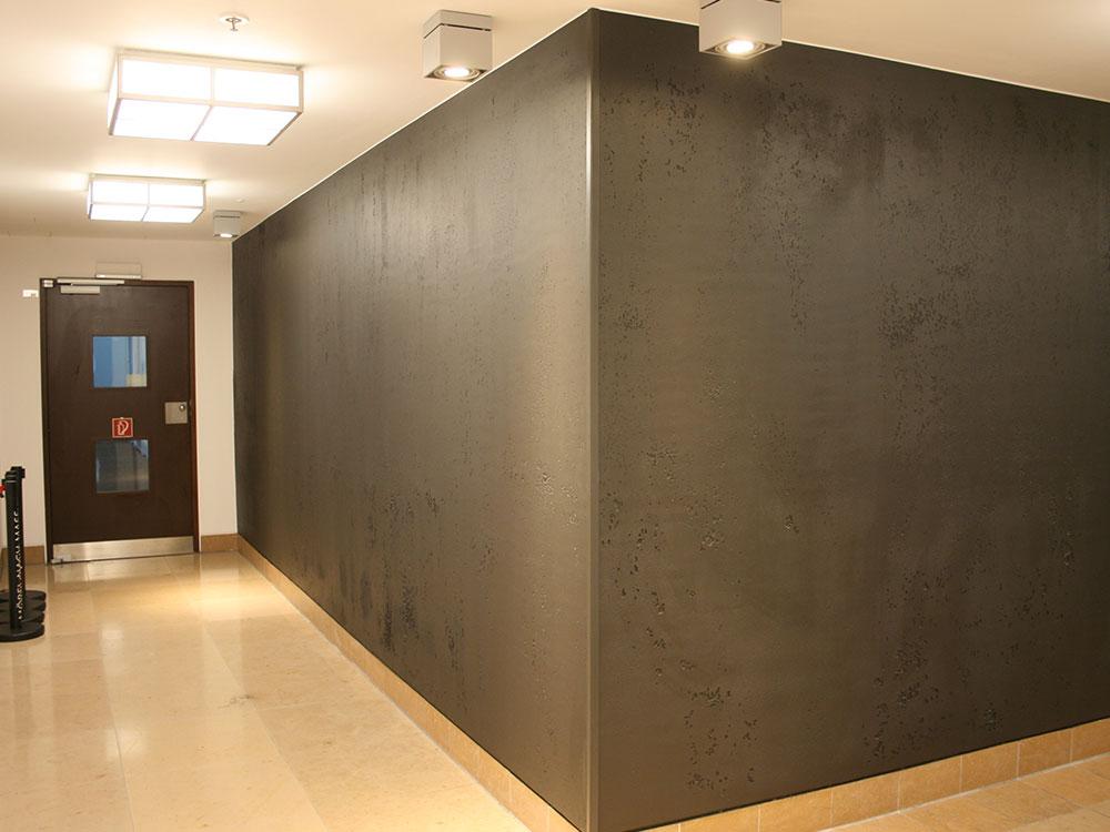Die gesamten Büroetage wurde überwiegend mit weißen Anstrichen an Decken und Wänden von uns überarbeitet. Der Akzent an den Empfangswänden brachte die gewünschte Kontrastwirkung. Strukturell wurden diese als Betonoberfläche mit Lunkern ausgeführt, farblich erhielten sie einen fast schwarzen Grauton.