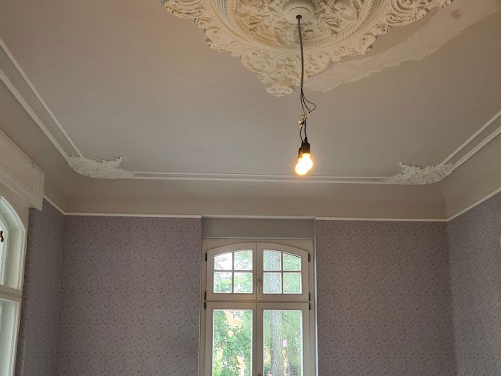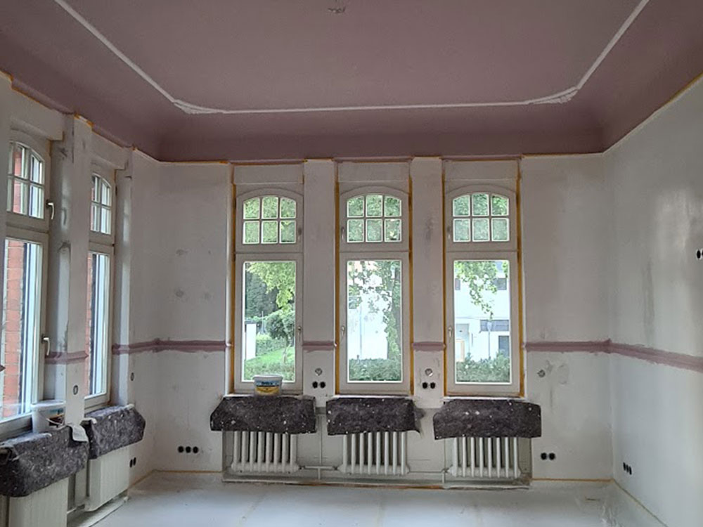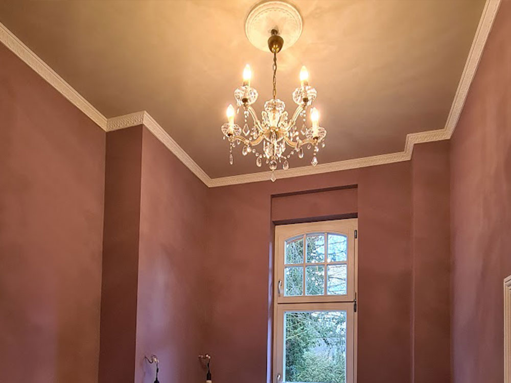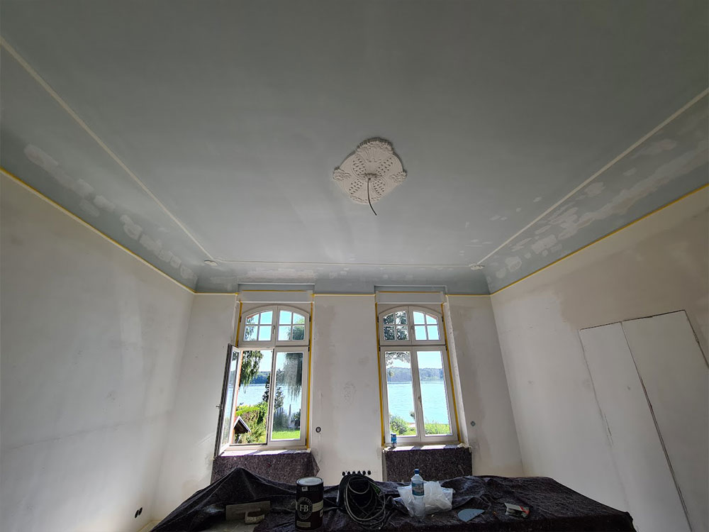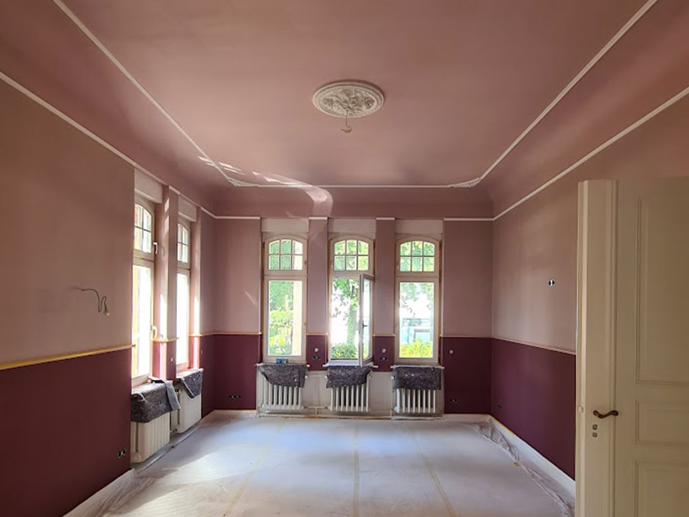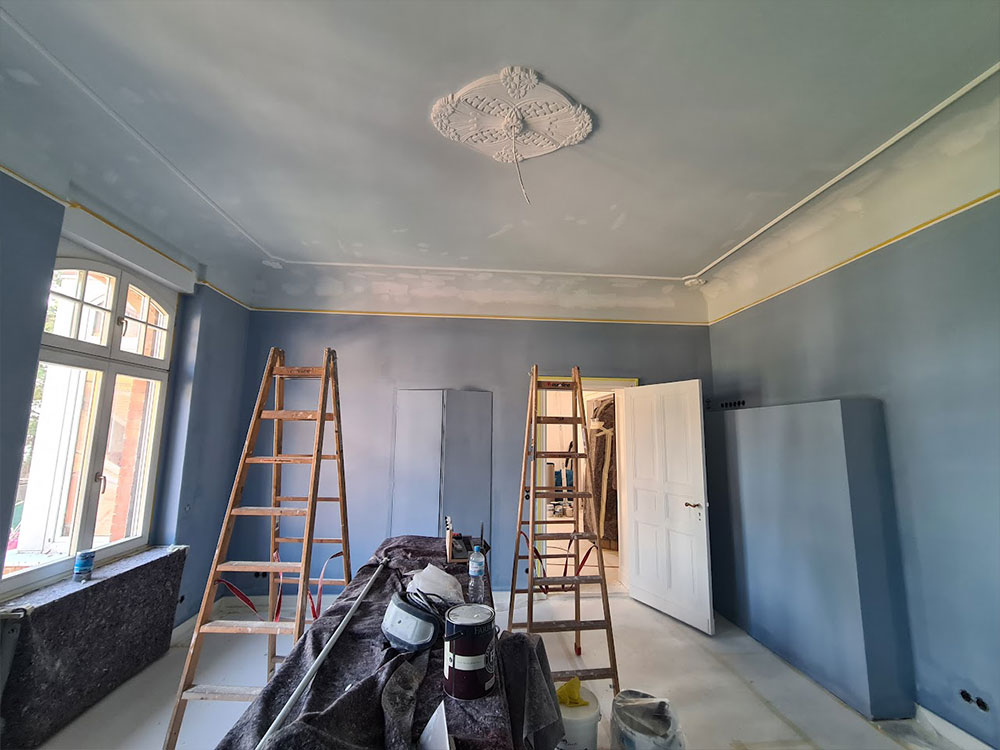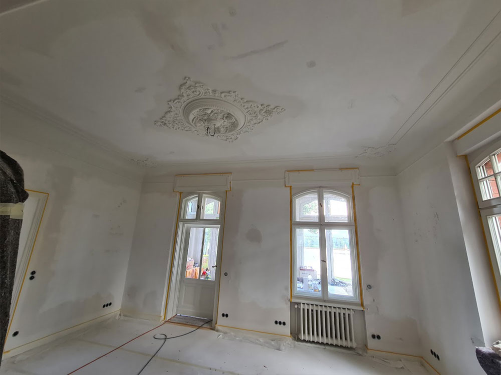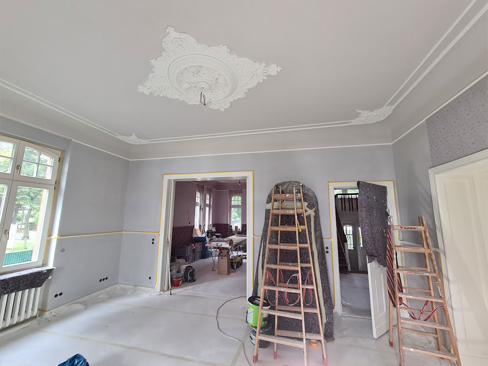 Zuerst angefragt für die Stuckarbeiten konnten wir darüber hinaus auch die Maler-, Lackier-, Tapezier- und Gestaltungsarbeiten umsetzen. Für die Realisierung der vielen Ideen und reichhaltigen Inspirationen unserer Kundin waren umfangreiche Fähigkeiten, organisatorisches Talent und Leidenschaft in der Umsetzung gefragt.