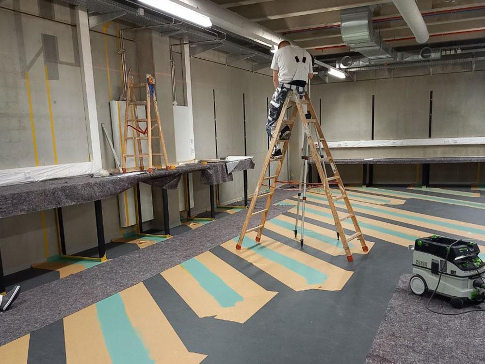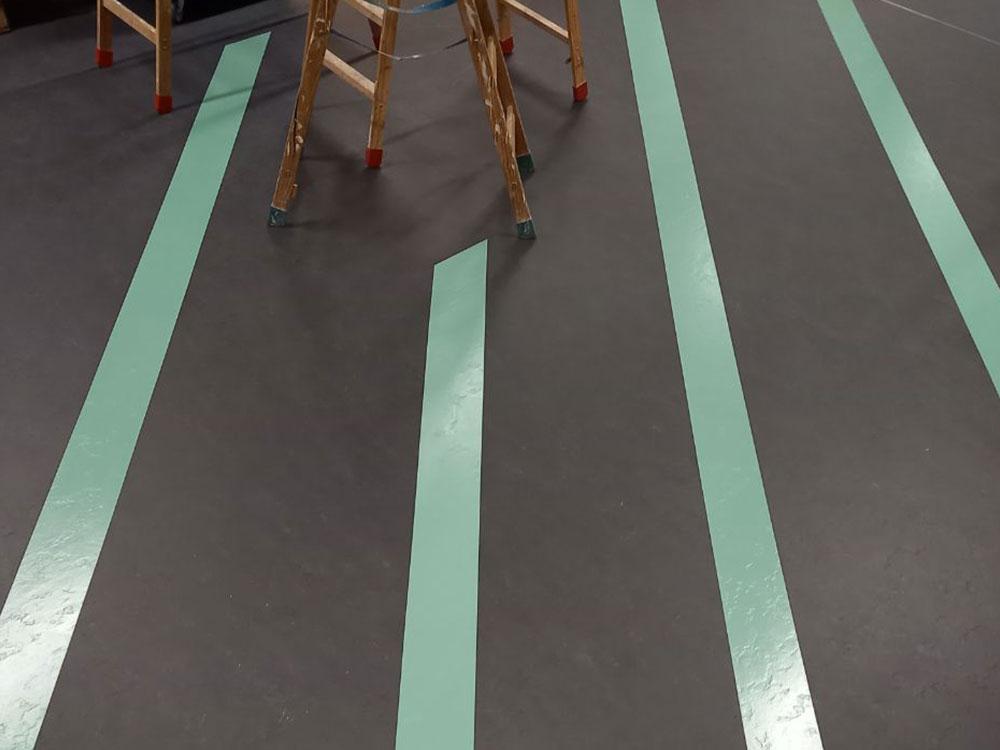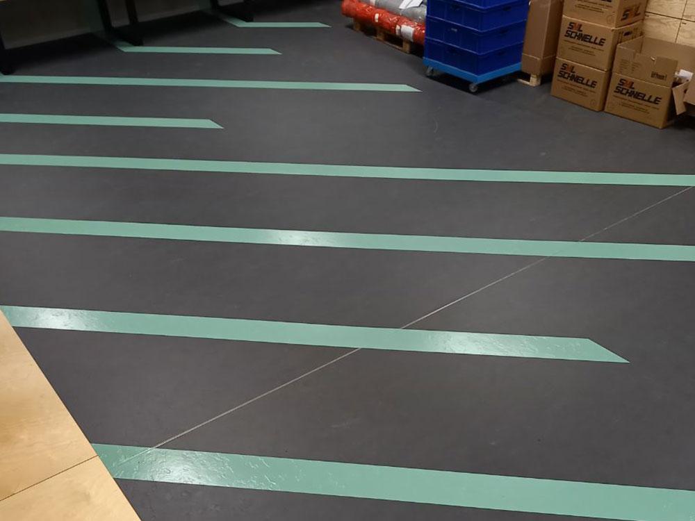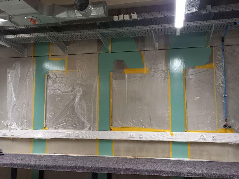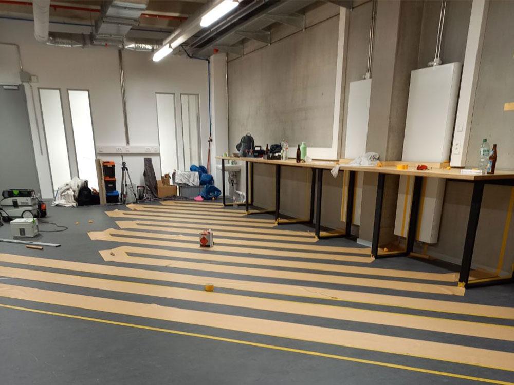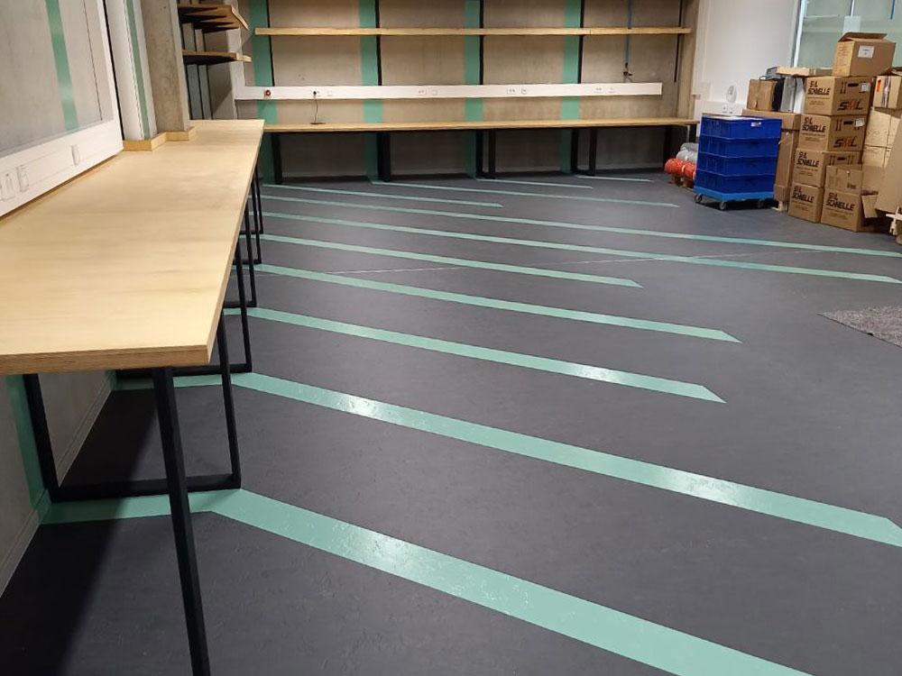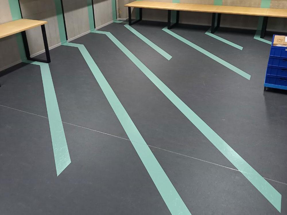 Unsere Kollegen von corpuslinea haben uns um Kooperation bei einem Projekt gebeten. Ein Arbeitsraum eines Industrieunternehmens benötigte als finalen Schliff Markierungen und Beschriftungen an Wänden und dem Fußboden. Wir hatten dabei die Aufgabe, die vorgegebenen Schriften und Linien exakt zu übertragen und mittels einer speziellen Lackfarbe, die auf Beton und dem Linoleumboden haftet, zu beschichten.