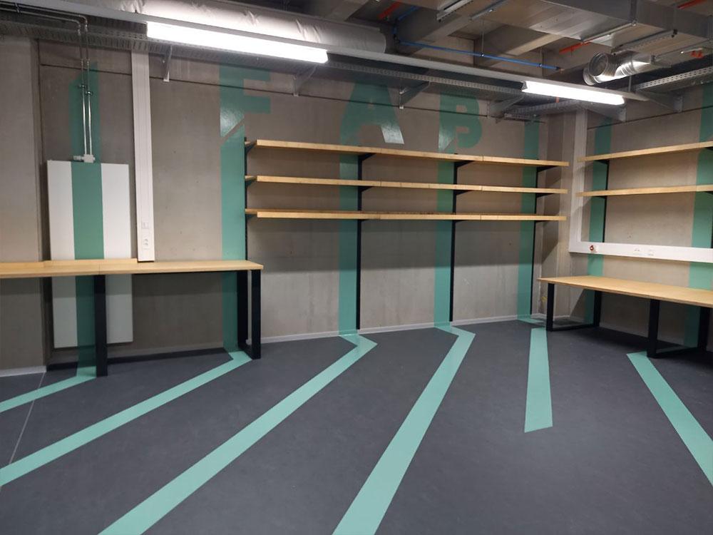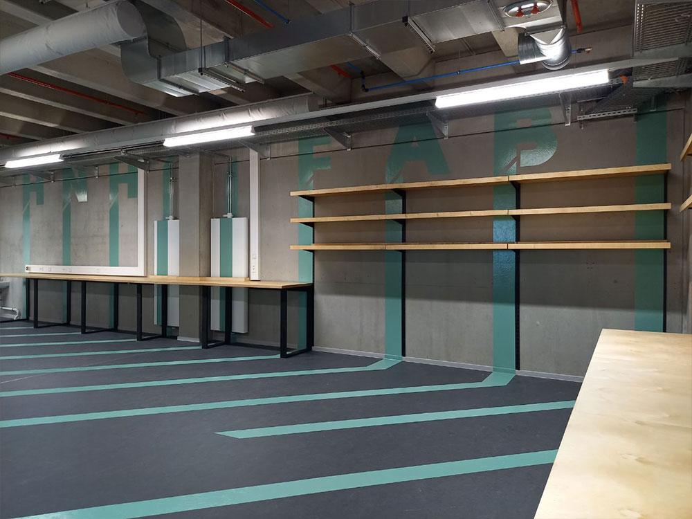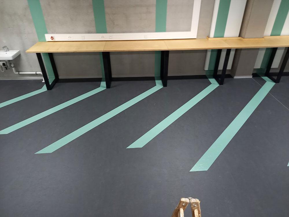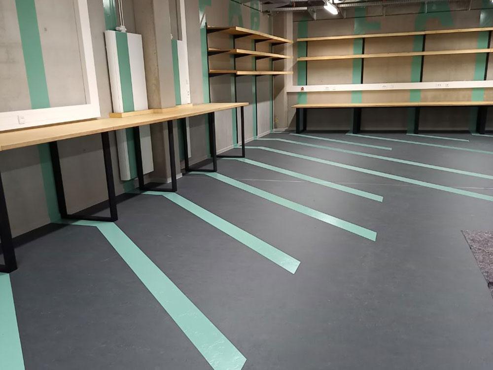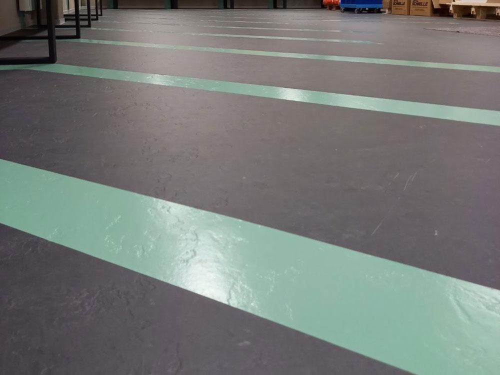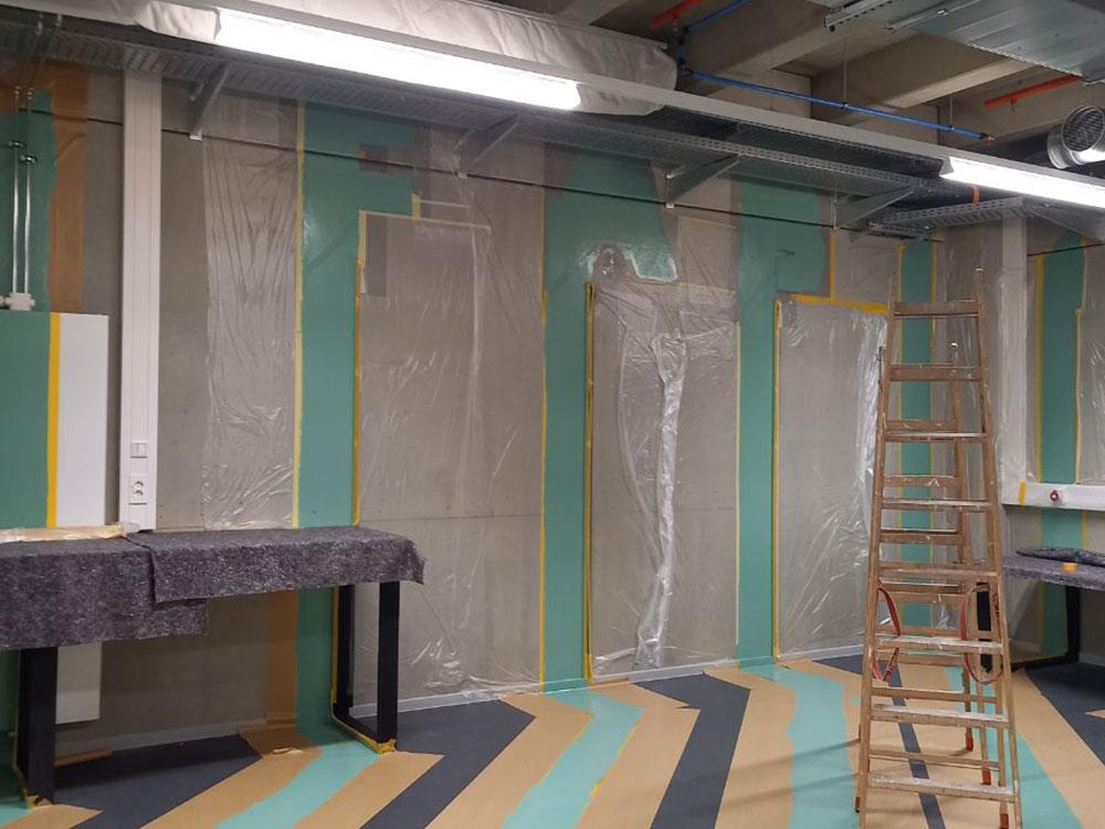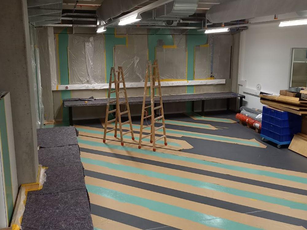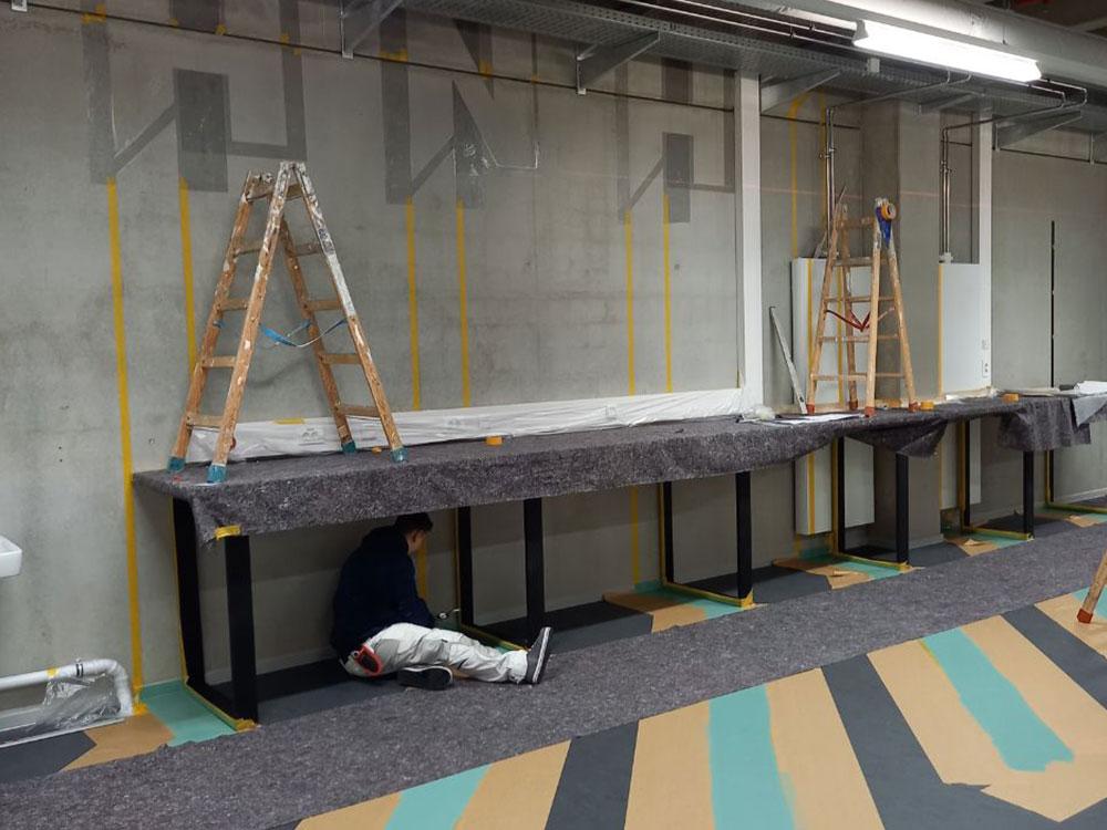 Unsere Kollegen von corpuslinea haben uns um Kooperation bei einem Projekt gebeten. Ein Arbeitsraum eines Industrieunternehmens benötigte als finalen Schliff Markierungen und Beschriftungen an Wänden und dem Fußboden. Wir hatten dabei die Aufgabe, die vorgegebenen Schriften und Linien exakt zu übertragen und mittels einer speziellen Lackfarbe, die auf Beton und dem Linoleumboden haftet, zu beschichten.