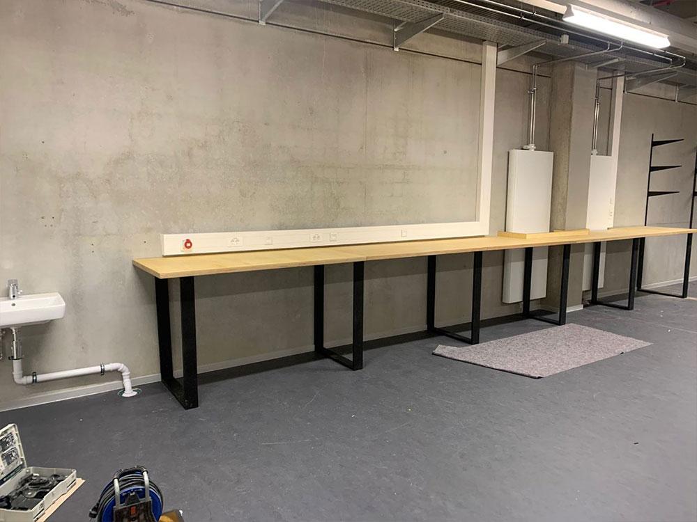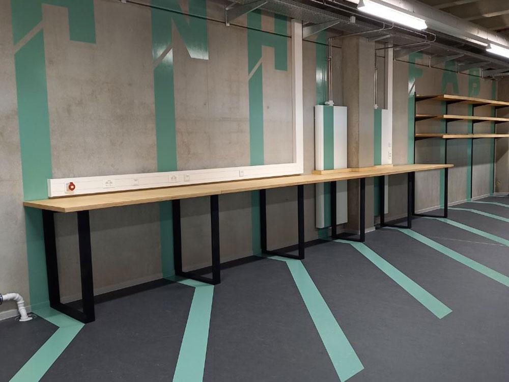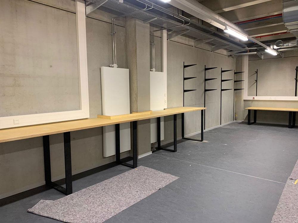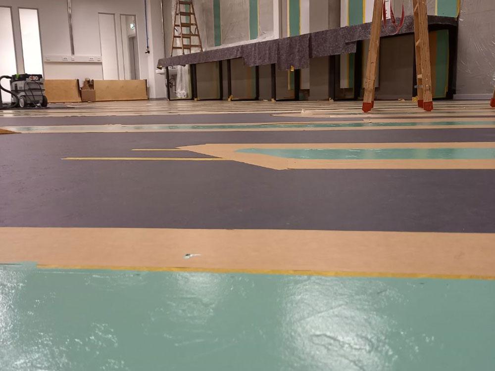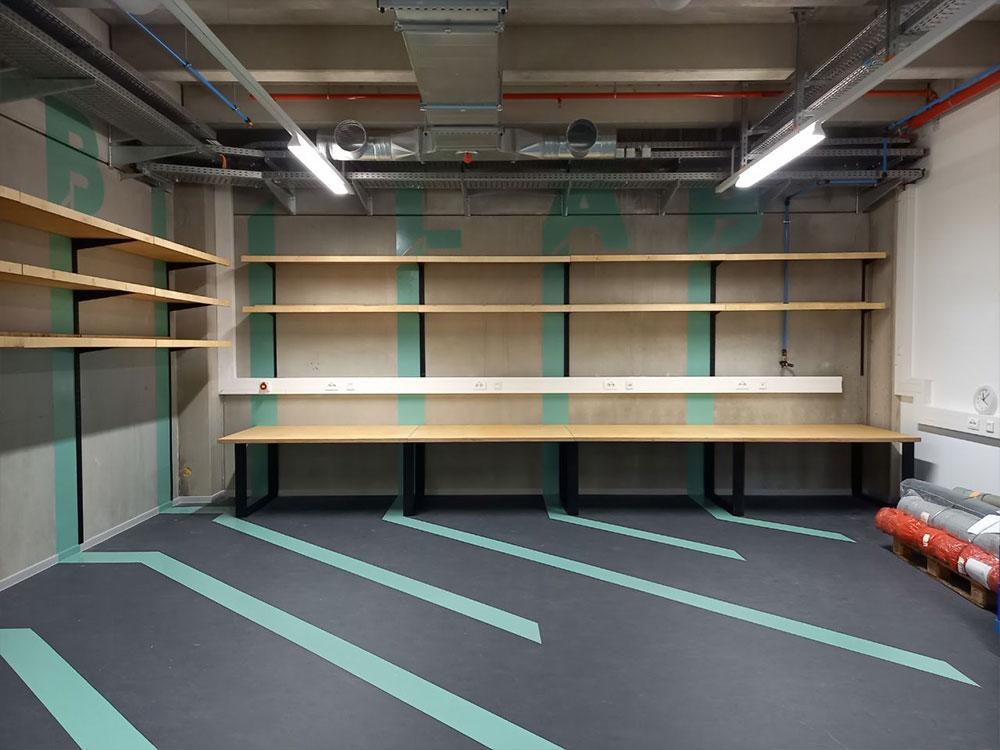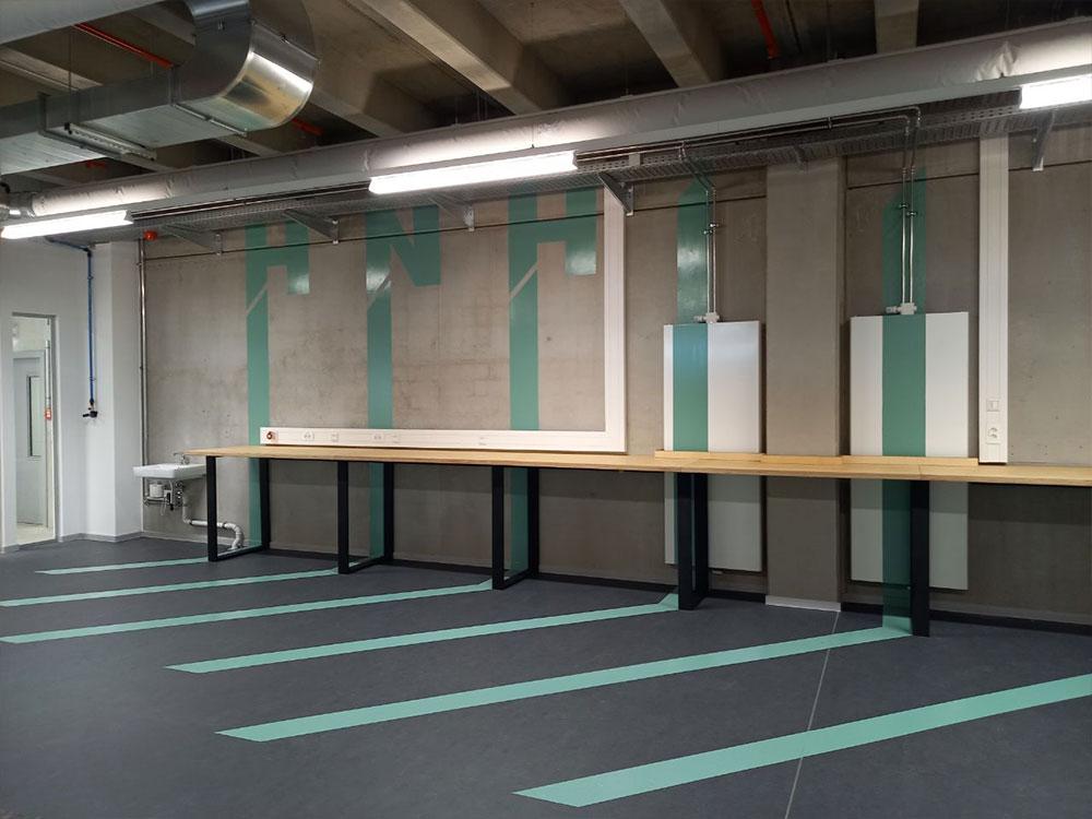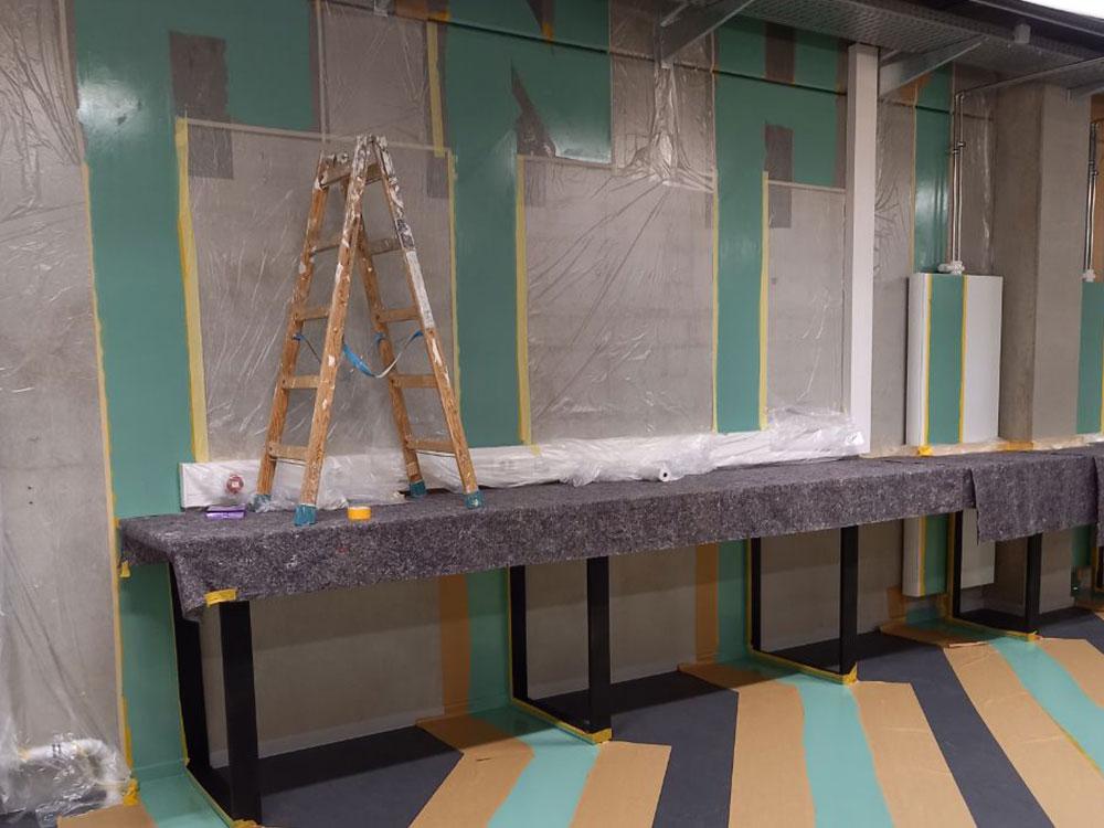 Unsere Kollegen von corpuslinea haben uns um Kooperation bei einem Projekt gebeten. Ein Arbeitsraum eines Industrieunternehmens benötigte als finalen Schliff Markierungen und Beschriftungen an Wänden und dem Fußboden. Wir hatten dabei die Aufgabe, die vorgegebenen Schriften und Linien exakt zu übertragen und mittels einer speziellen Lackfarbe, die auf Beton und dem Linoleumboden haftet, zu beschichten.